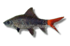 Feuerschwanz-Fransenlipper Epalzeorhynchos bicolor (SMITH, 1931) Dieser langgestreckte Fisch ist sehr populär, vor allem wegen des Farbkontrastes zwischen dem schwarzen Körper und der scharlachroten Schwanzflosse. Bei manchen Tieren können die samtschwarzen Flossen zusätzlich eine weiße Spitze aufweisen. Im Gegensatz zu den Männchen, deren Bauchlinie weitgehend gerade verläuft, ist sie bei den Weibchen etwas fülliger ausgebildet. Die Köperform dieser thailändischen Art erinnert etwas an die eines Haies. Ein revierbildender Fisch, der nicht zögert wenn es um die Verteidigung seines Lebensraumes geht. Rivalen werden heftigst attackiert, vor allem Artgenossen und ähnlich aussehende Fische. Um die Aggressivität in Grenzen zu halten, sollte das Aquarium dicht bepflanzt sein und reichlich Verstecke bieten. Durch geschicktes Anordnen können z.B. Steine und Wurzeln als Sichtschutz dienen. Außerdem empfiehlt sich die Einzelhaltung oder die Haltung von über drei Tieren, auch das trägt dazu bei die Aggressivität etwas zu unterdrücken. Epalzeorhynchos bicolor nimmt alle kleine Futtersorten, besonders Pflanzenfutter. Mit ihrem unterständigen Maul sind sie in der Lage Steine und Wurzeln 'abzuweiden'. Neben Algen fressen sie aber auch Salatblätter und Gurken. Eine ähnliche Art ist Epalzeorhynchos frenatum, die ein schlankeres Profil hat und bei der alle Flossen rot sind. [Roland Selzer]